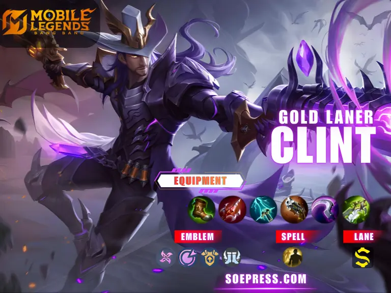 - Gunakan emblem Marksman dengan talent Killing Spree. Efek penyembuhan HP dan tambahan Movement Speed setelah kill akan membuat Clint bertahan lebih lama dan agresif saat team fight.